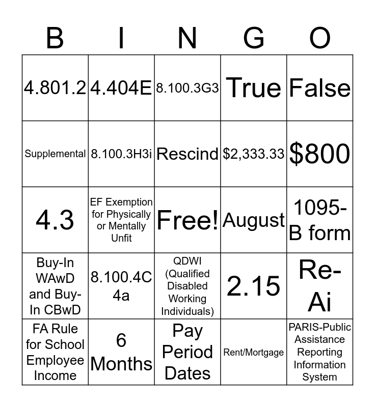 This bingo card has a free space and 29 words: FA Rule for School Employee Income, 4.506 C, EF Exemption for Physically or Mentally Unfit, 4.403F, 4.801.2, 8.100.3G3, 8.100.3H3i, 8.100.4C 4a, August, 6 Months, 1095-B form, PARIS-Public Assistance Reporting Information System, Pay Period Dates, Rent/Mortgage, $800, Last four of their SSN or their birth year, QDWI (Qualified Disabled Working Individuals), Buy-In WAwD and Buy-In CBwD, False, 4.3, 2.15, 08/01/2017, $2,333.33, Supplemental, True, 4.404E, Re-Ai, Rescind and $490.