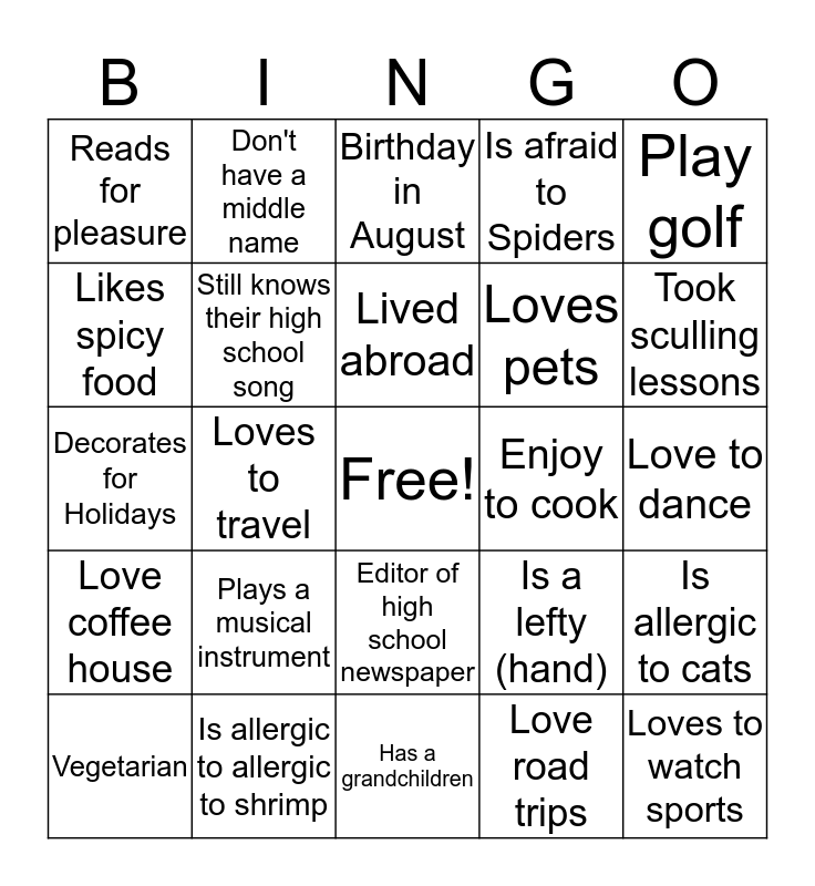 This bingo card has a free space and 24 words: Plays a musical instrument, Is allergic to allergic to shrimp, Lived abroad, Vegetarian, Play golf, Reads for pleasure, Likes spicy food, Don't have a middle name, Enjoy to cook, Editor of high school newspaper, Loves pets, Decorates for Holidays, Is a lefty (hand), Is allergic to cats, Still knows their high school song, Love road trips, Love to dance, Birthday in August, Took sculling lessons, Loves to travel, Loves to watch sports, Love coffee house, Is afraid to Spiders and Has a grandchildren.