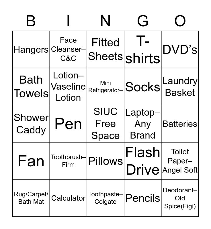 This bingo card has a free space and 50 words: Soap–Dove, Deodorant–Old Spice(Figi), Body Wash–Old Spice Mouth Wash–Any Brand, Toothpaste–Colgate, Toothbrush–Firm, Dental Floss–Any Brand, Face Cleanser–C&C, Q-tips Cotton Swabs, Bath Towels, Wash Cloths, Lotion– Vaseline Lotion, T-shirts, Toilet Paper– Angel Soft, Flash Drive, Printer Paper, Note books– College Ruled, Mini Refrigerator–, Laptop– Any Brand, CD, DVD’s, Pen, Pencils, Hangers, Socks, Detergent-(Xtra), Fabric Softener-Downy, Laundry Basket, Flat Sheets, Fitted Sheets, Pillows, Pillow Cases, Alarm Clock, Cleaning Supplies, Back Pack, Calculator, Can Opener, Dishes, Silverware, Flashlight, Batteries, First Aid Kit, Iron, Ironing Board, Power Strip, Rug/Carpet/ Bath Mat, Shower Caddy, Shower Shoes, Umbrella, Fan and Gift Cards.