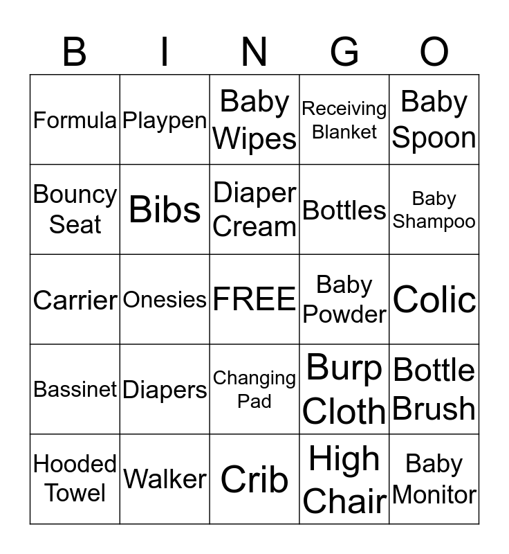 This bingo card has a free space and 50 words: Baby Socks, Baby Monitor, Pacifiers, Crib, Diapers, Blanket, Playpen, Teething Ring, Bouncy Seat, Mobile, Bibs, Receiving Blanket, Bottle Brush, Burp Cloth, Stroller, Car Seat, Diaper Cream, Baby Powder, Diaper Pail, Baby Spoon, Onesies, High Chair, Formula, Bottles, Brush & Comb, Rattles, Baby Shampoo, Diaper Bag, Baby Wipes, Changing Pad, Nail Clippers, Thermometer, Memory Book, Booties, Walker, Daughter, Bath Time, Nursery, Lullaby, Colic, Bonnett, Crying, Giggle, Baby Swing, Hooded Towel, Carrier, Baby Lotion, Wash Cloths, Bassinet and Mittens.