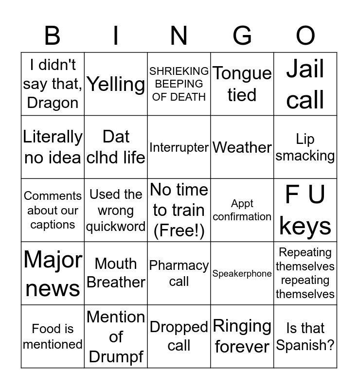 This bingo card has a free space and 24 words: Mouth Breather, Mention of Drumpf, Interrupter, Food is mentioned, Jail call, I didn't say that, Dragon, Literally no idea, Yelling, Appt confirmation, Pharmacy call, Weather, Comments about our captions, Speakerphone, Repeating themselves repeating themselves, Dat clhd life, Ringing forever, F U keys, SHRIEKING BEEPING OF DEATH, Lip smacking, Used the wrong quickword, Is that Spanish?, Major news, Tongue tied and Dropped call.