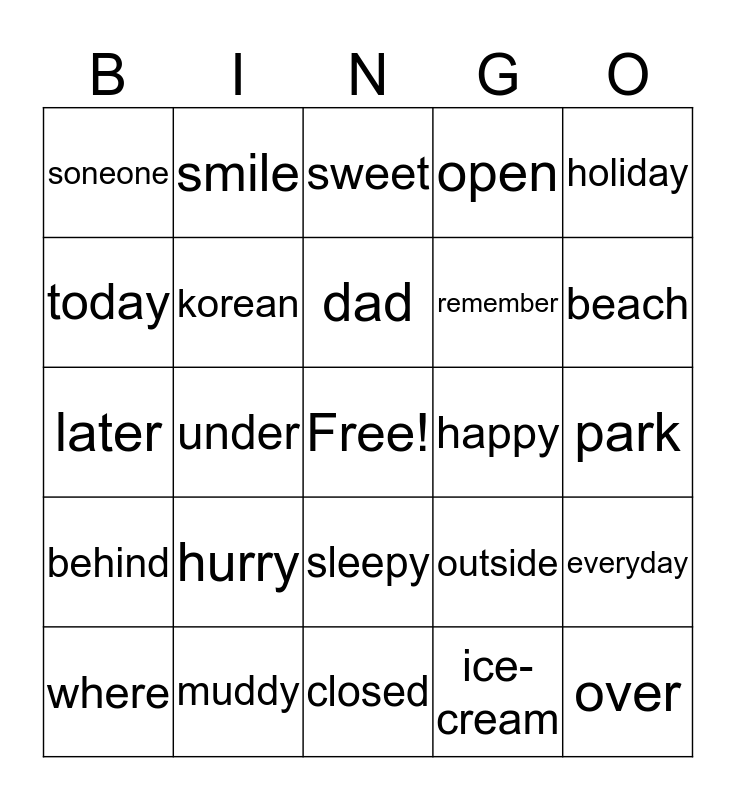 This bingo card has a free space and 24 words: hurry, muddy, dad, where, holiday, soneone, today, smile, happy, sleepy, remember, later, outside, everyday, korean, ice-cream, park, sweet, beach, under, over, behind, open and closed.