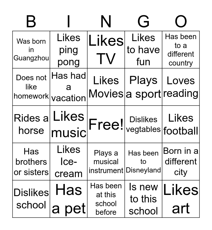 This bingo card has a free space and 24 words: Likes Ice-cream, Has a pet, Likes Movies, Dislikes school, Has been to a different country, Was born in Guangzhou, Does not like homework, Likes ping pong, Dislikes vegtables, Plays a musical instrument, Plays a sport, Rides a horse, Has been to Disneyland, Born in a different city, Has had a vacation, Is new to this school, Likes football, Likes TV, Loves reading, Likes music, Likes art, Has brothers or sisters, Likes to have fun and Has been at this school before.