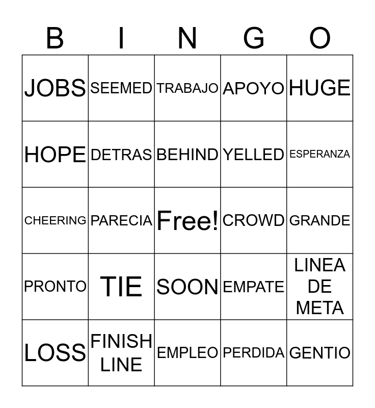 This bingo card has a free space and 24 words: TIE, FINISH LINE, BEHIND, LOSS, HUGE, JOBS, HOPE, SEEMED, CROWD, SOON, YELLED, CHEERING, EMPATE, LINEA DE META, DETRAS, PERDIDA, GRANDE, TRABAJO, ESPERANZA, PARECIA, GENTIO, PRONTO, APOYO and EMPLEO.