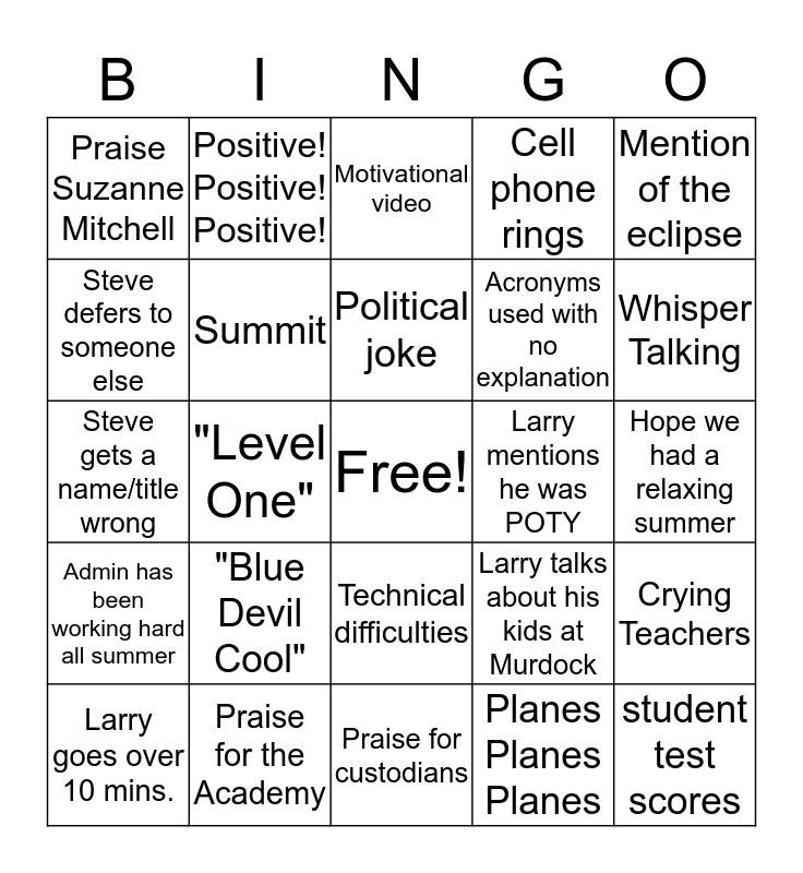 This bingo card has a free space and 24 words: "Blue Devil Cool", Praise for the Academy, Political joke, Larry goes over 10 mins., Mention of the eclipse, Praise Suzanne Mitchell, Steve defers to someone else, Positive! Positive! Positive!, Larry mentions he was POTY, Technical difficulties, Acronyms used with no explanation, Steve gets a name/title wrong, Larry talks about his kids at Murdock, Crying Teachers, Summit, Planes Planes Planes, Hope we had a relaxing summer, Motivational video, Whisper Talking, "Level One", student test scores, Admin has been working hard all summer, Cell phone rings and Praise for custodians.