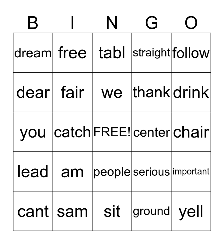 This bingo card has a free space and 24 words: am, sam, we, cant, follow, dream, dear, free, center, people, thank, you, serious, important, fair, ground, chair, tabl, drink, catch, yell, lead, straight and sit.