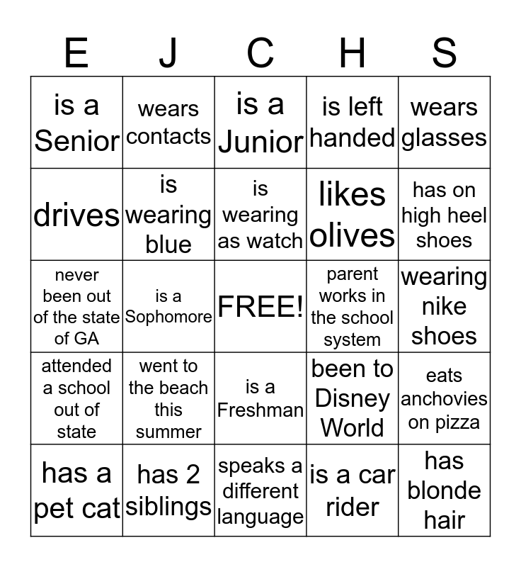 This bingo card has a free space and 24 words: went to the beach this summer, has 2 siblings, is wearing as watch, has a pet cat, wears glasses, is a Senior, drives, wears contacts, parent works in the school system, is a Freshman, likes olives, never been out of the state of GA, been to Disney World, eats anchovies on pizza, is wearing blue, is a car rider, wearing nike shoes, is a Junior, has on high heel shoes, is a Sophomore, has blonde hair, attended a school out of state, is left handed and speaks a different language.