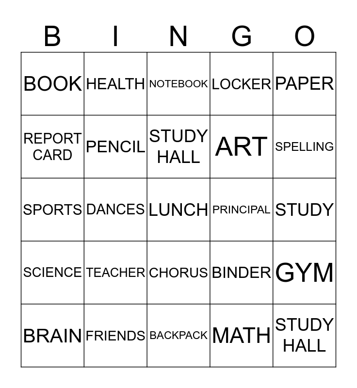 This bingo card has a free space and 29 words: BRAIN, CAFETERIA, DANCES, SNOW DAY, BOOK, NOTEBOOK, PENCIL, TEACHER, PRINCIPAL, FRIENDS, STUDY, STUDY HALL, BACKPACK, MATH, SPELLING, HOMEWORK, CHORUS, SCIENCE, PAPER, SPORTS, BINDER, SOCIAL STUDIES, ART, REPORT CARD, LOCKER, HEALTH, GYM, STUDY HALL and VOCABULARY.