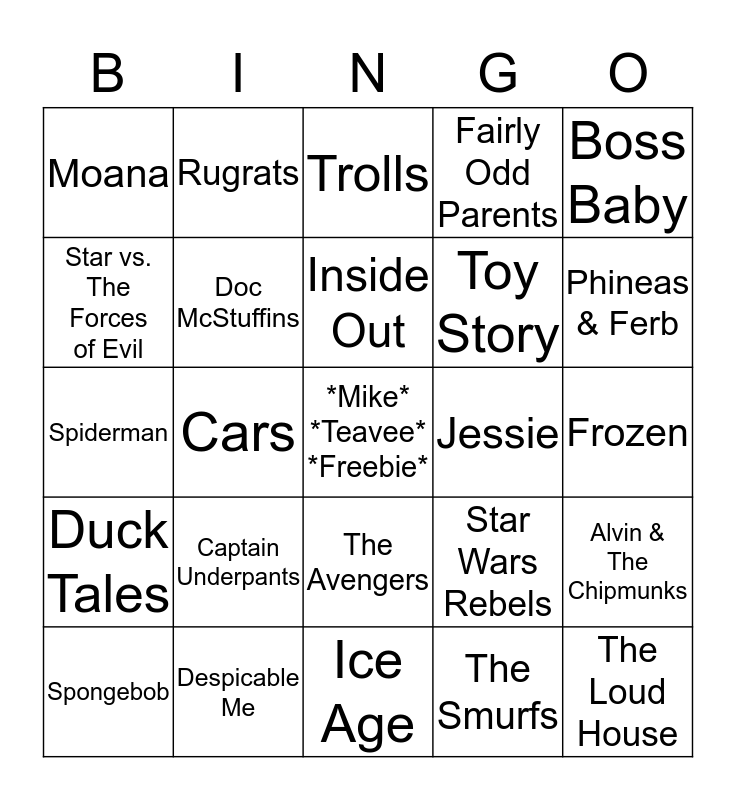 This bingo card has a free space and 24 words: Captain Underpants, Despicable Me, Inside Out, Spongebob, Boss Baby, Moana, Star vs. The Forces of Evil, Rugrats, Jessie, The Avengers, Toy Story, Spiderman, Star Wars Rebels, Alvin & The Chipmunks, Doc McStuffins, The Smurfs, Frozen, Trolls, Phineas & Ferb, Cars, The Loud House, Duck Tales, Fairly Odd Parents and Ice Age.