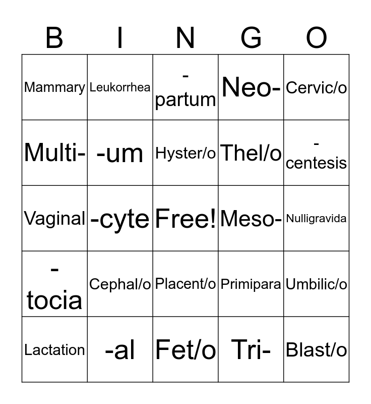 This bingo card has a free space and 24 words: Cephal/o, -al, Hyster/o, Lactation, Cervic/o, Mammary, Multi-, Leukorrhea, Meso-, Placent/o, Thel/o, Vaginal, Primipara, Umbilic/o, -um, Tri-, Nulligravida, -partum, -centesis, -cyte, Blast/o, -tocia, Neo- and Fet/o.