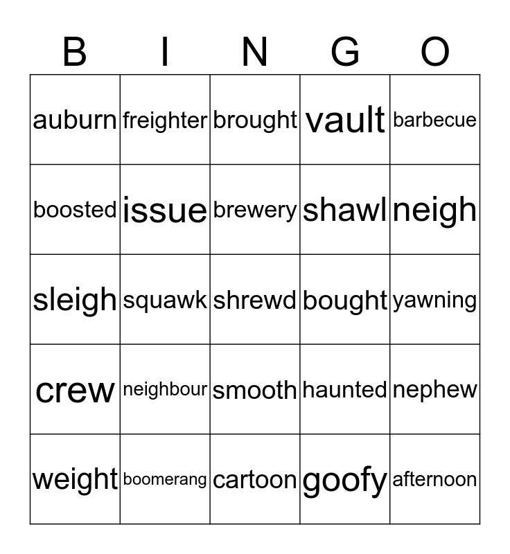 This bingo card has 25 words: neighbour, cartoon, brewery, weight, barbecue, auburn, boosted, freighter, bought, smooth, shawl, sleigh, haunted, nephew, issue, afternoon, yawning, brought, neigh, squawk, shrewd, boomerang, crew, vault and goofy.