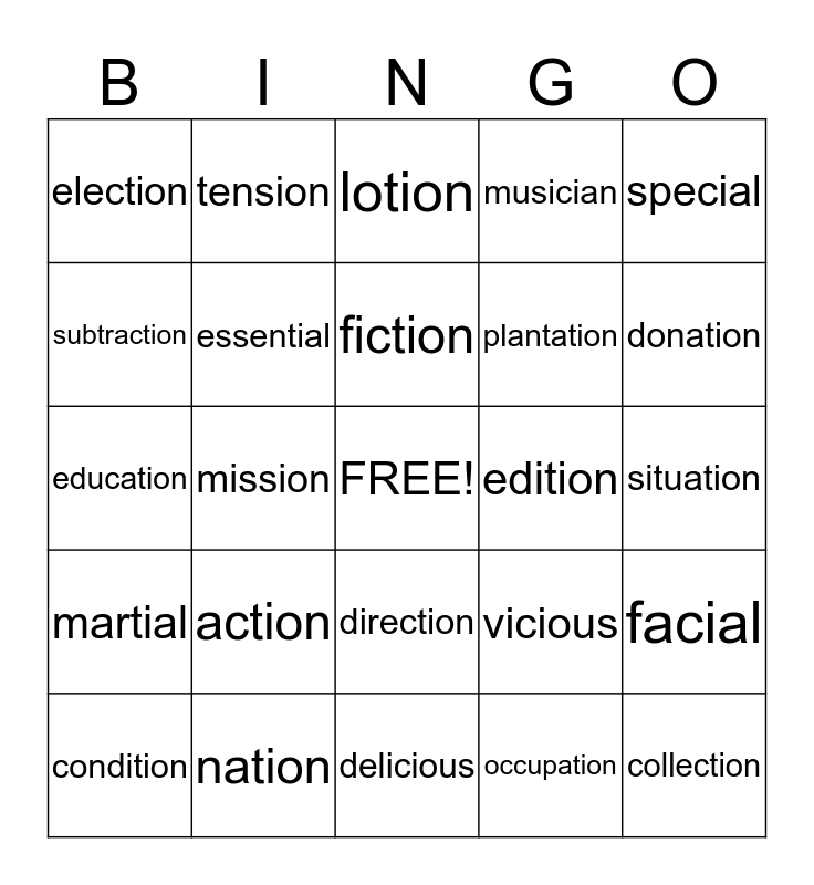 This bingo card has a free space and 24 words: action, nation, fiction, condition, special, election, subtraction, tension, edition, direction, plantation, education, vicious, facial, essential, occupation, situation, lotion, donation, mission, collection, martial, musician and delicious.