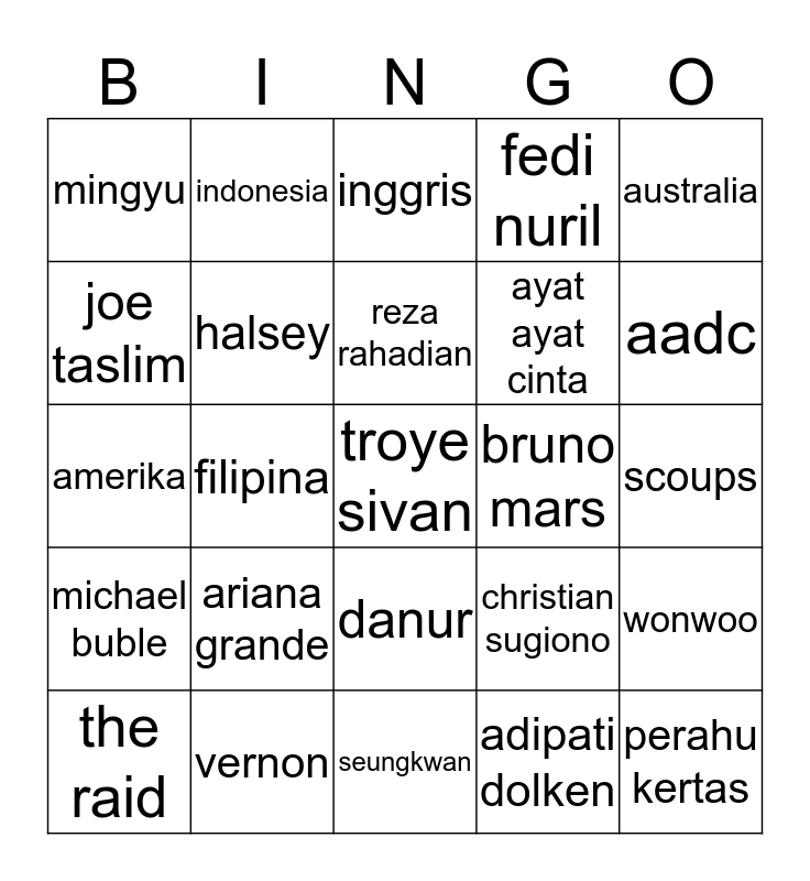 This bingo card has a free space and 24 words: ariana grande, vernon, reza rahadian, the raid, australia, mingyu, joe taslim, indonesia, bruno mars, danur, ayat ayat cinta, amerika, christian sugiono, wonwoo, halsey, adipati dolken, scoups, inggris, aadc, filipina, perahu kertas, michael buble, fedi nuril and seungkwan.