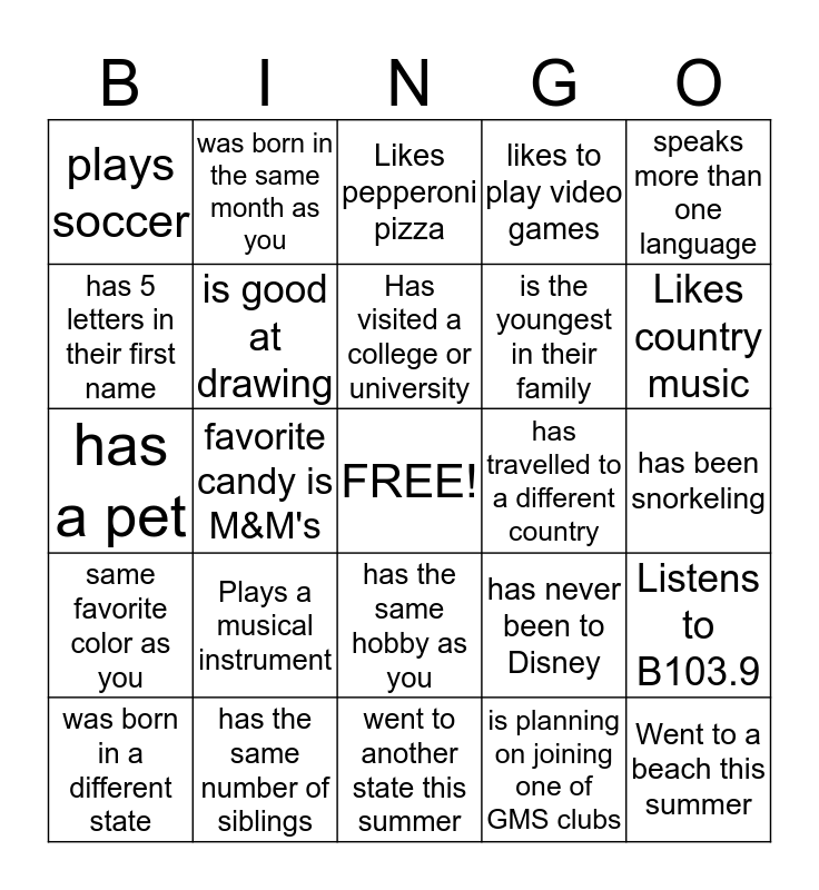 This bingo card has a free space and 24 words: Plays a musical instrument, has the same number of siblings, Has visited a college or university, was born in a different state, speaks more than one language, plays soccer, has 5 letters in their first name, was born in the same month as you, has travelled to a different country, has the same hobby as you, is the youngest in their family, has a pet, has never been to Disney, Listens to B103.9, is good at drawing, is planning on joining one of GMS clubs, has been snorkeling, Likes pepperoni pizza, Likes country music, favorite candy is M&M's, Went to a beach this summer, same favorite color as you, likes to play video games and went to another state this summer.
