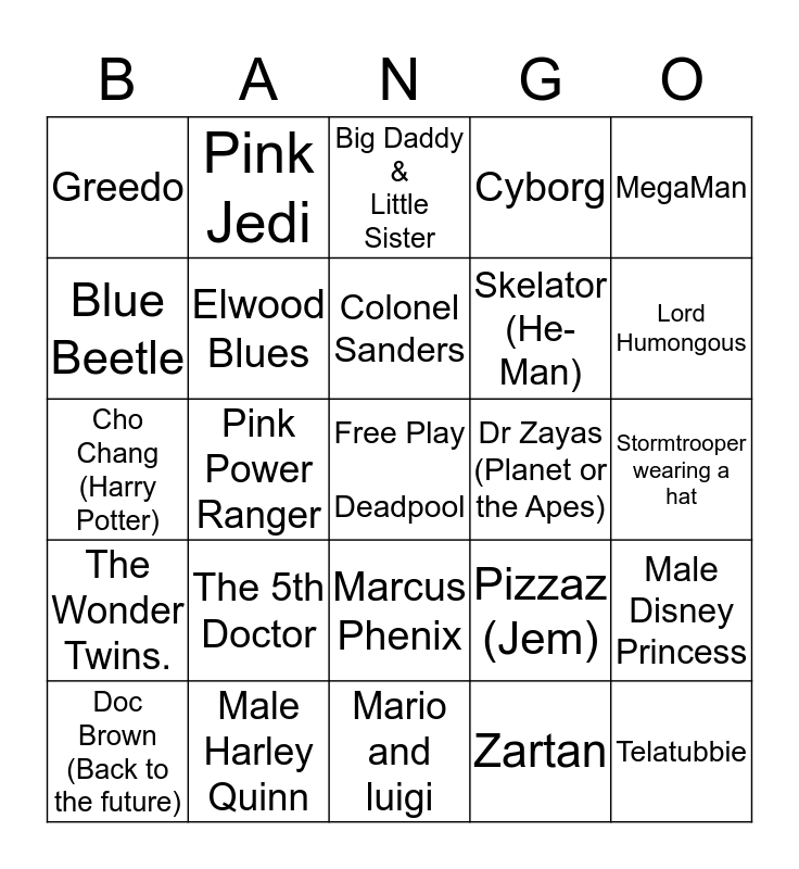 This bingo card has a free space and 29 words: Doc Brown (Back to the future), Ant man & Wasp, Pink Power Ranger, Spider-Man wearing sneakers., Greedo, Big Daddy & Little Sister, Elwood Blues, The 5th Doctor, Dr Zayas (Planet or the Apes), Male Harley Quinn, Stormtrooper wearing a hat, Telatubbie, Mario and luigi, Zartan, Lord Humongous, Female Thor, Marcus Phenix, The Wonder Twins., MegaMan, Cho Chang (Harry Potter), Pizzaz (Jem), Red skull, Skelator (He-Man), Blue Beetle, Cyborg, Pink Jedi, Male Disney Princess, Colonel Sanders and Tormund Giantsbane.
