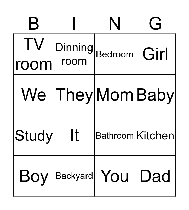 This bingo card has 16 words: Backyard, Kitchen, Bedroom, TV room, Study, Dinning room, Bathroom, You, We, They, Boy, Girl, It, Baby, Mom and Dad.