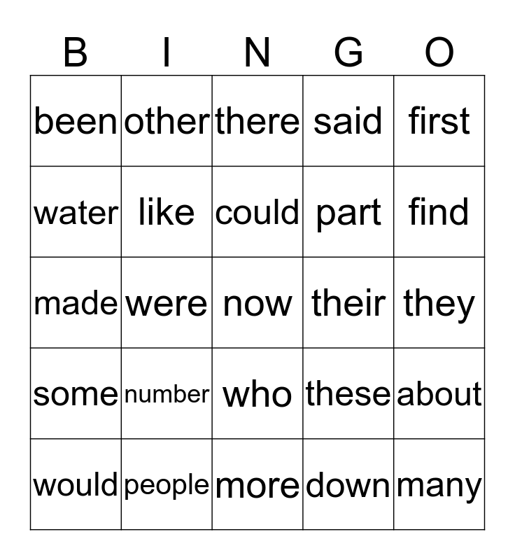 This bingo card has a free space and 24 words: number, people, could, would, first, been, water, other, their, who, part, made, these, about, like, down, they, there, find, were, many, some, said and more.