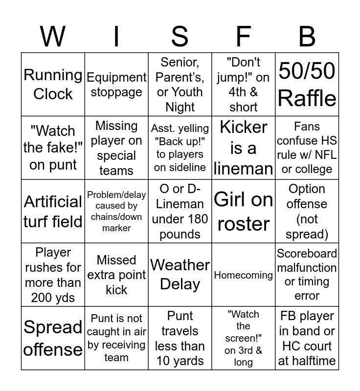 This bingo card has 25 words: Missed extra point kick, Punt travels less than 10 yards, Asst. yelling "Back up!" to players on sideline, Spread offense, 50/50 Raffle, Running Clock, "Watch the fake!" on punt, Equipment stoppage, Girl on roster, Weather Delay, Kicker is a lineman, Artificial turf field, Homecoming, Scoreboard malfunction or timing error, Missing player on special teams, FB player in band or HC court at halftime, Option offense (not spread), Senior, Parent’s, or Youth Night, Fans confuse HS rule w/ NFL or college, Problem/delay caused by chains/down marker, O or D-Lineman under 180 pounds, Punt is not caught in air by receiving team, Player rushes for more than 200 yds, "Don't jump!" on 4th & short and "Watch the screen!" on 3rd & long.