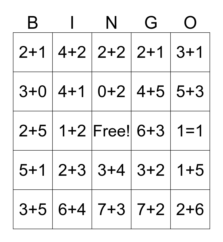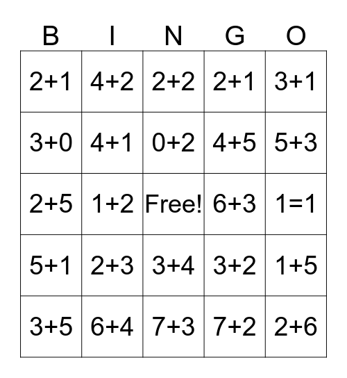 This bingo card has a free space and 24 words: 2+3, 6+4, 0+2, 3+5, 3+1, 2+1, 3+0, 4+2, 6+3, 3+4, 4+5, 2+5, 3+2, 1+5, 4+1, 7+2, 1=1, 2+2, 5+3, 1+2, 2+6, 5+1, 2+1 and 7+3.