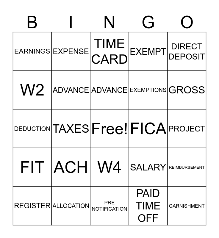 This bingo card has a free space and 24 words: ACH, ALLOCATION, ADVANCE, REGISTER, DIRECT DEPOSIT, EARNINGS, W2, EXPENSE, FICA, W4, EXEMPTIONS, DEDUCTION, SALARY, REIMBURSEMENT, ADVANCE, PAID TIME OFF, PROJECT, TIME CARD, GROSS, TAXES, GARNISHMENT, FIT, EXEMPT and PRE NOTIFICATION.