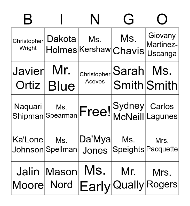This bingo card has a free space and 24 words: Ms. Spellman, Mason Nord, Christopher Aceves, Jalin Moore, Giovany Martinez-Uscanga, Christopher Wright, Javier Ortiz, Dakota Holmes, Sydney McNeill, Da'Mya Jones, Sarah Smith, Naquari Shipman, Ms. Speights, Mrs. Pacquette, Mr. Blue, Mr. Qually, Carlos Lagunes, Ms. Kershaw, Ms. Smith, Ms. Spearman, Mrs. Rogers, Ka'Lone Johnson, Ms. Chavis and Ms. Early.