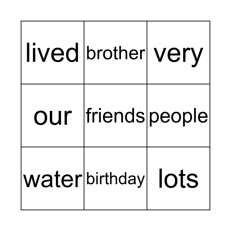 This bingo card has 18 words: Saturday, going, very, lived, watched, our, bought, brother, birthday, lots, night, friends, park, people, water, again, other and really.