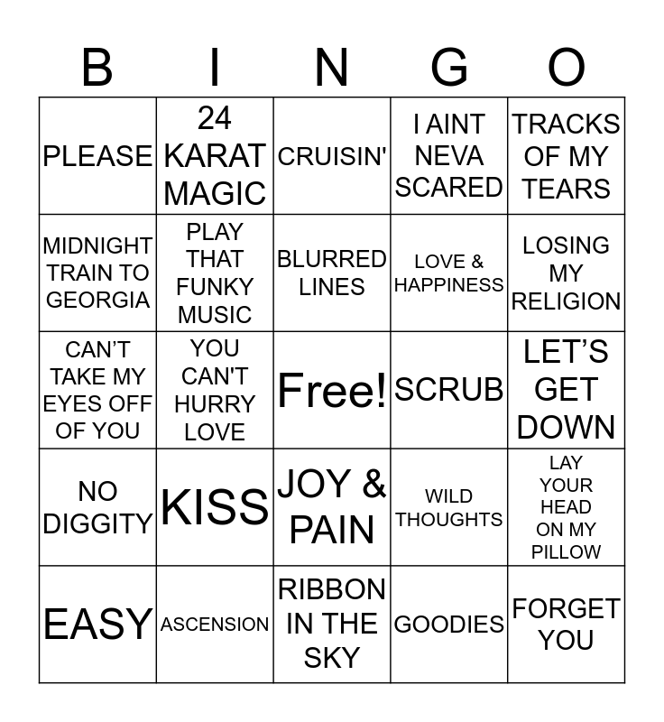 This bingo card has a free space and 92 words: SIGNED SEALED DELIVERED, SUPERSTITION, RIBBON IN THE SKY, AIN'T TO PROUD TO BEG, MY GIRL, JUST MY IMAGINATION, BRICK HOUSE, EASY, ALL NIGHT LONG, LET'S GROOVE TONIGHT, SEPTEMBER, CELEBRATION, JUNGLE BOOGIE, LOVE & HAPPINESS, LET’S STAY TOGETHER, TRACKS OF MY TEARS, CRUISIN', I'LL BE AROUND, WHAT'S GOIN' ON, LET'S GET IT ON, MERCY MERCY ME, AIN'T NO MOUNTAIN HIGH ENOUGH, BURN RUBBER, WORD UP, KISS, PLAY THAT FUNKY MUSIC, THE POWER OF LOVE, LOVELY DAY, LOVE T.K.O, CLOSE THE DOOR, ASCENSION, JOY & PAIN, HAVE I TOLD YOU LATELY THAT I LOVE YOU, I SHOT THE SHERIFF, 24 KARAT MAGIC, UPTOWN FUNK, ALL OF ME, HAPPY, BLURRED LINES, WILD THOUGHTS, CAN’T TAKE MY EYES OFF OF YOU, NO DIGGITY, LET’S GET DOWN, HEY YA, FORGET YOU, TWIST & SHOUT, IT'S YOUR THING, LAND OF A 1000 DANCES, TRY A LITTLE TENDERNESS, DOCK OF THE BAY, HOW SWEET IT IS, HIGHER & HIGHER, NOWHERE TO RUN, DANCING IN THE STREET, DANCE TO THE MUSIC, ROCK STEADY, RESPECT, MIDNIGHT TRAIN TO GEORGIA, AT LAST, YOU CAN'T HURRY LOVE, THE THRILL IS GONE, JOHNNIE B. GOOD, PROUD MARY, GEORGIA ON MY MIND, UNBREAK MY HEART, GOODIES, JUST ONE OF THOSE DAYS, YEAH, YOU CAN HAVE WHATEVER YOU LIKE, GET LOW, PRETTY GIRL ROCK, MS. JACKSON, I AINT NEVA SCARED, FORGET YOU, VICE VERSA, BABY, LAY YOUR HEAD ON MY PILLOW, LAFFY TAFFY, HIT THE ROAD JACK, NIGHT AND DAY, WATERFALLS, SCRUB, PLEASE, IT’S A MAN’S WORLD, FREAKAZOID, THE WHISPER SONG, HOW DO I LIVE WITHOUT YOU, MS NEW BOOTY, SUGARLAND, LOVE SHACK, LOSING MY RELIGION and CRUISE.
