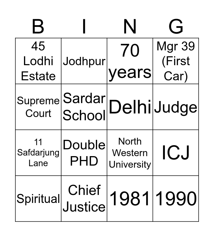 This bingo card has 52 words: Golf, Spiritual, Den Hague, Peace Palace, Netherlands, India, Jodhpur, Jodhpur University, Sardar School, Sarvajanik School, Delhi, Bombay, Chicago, LLB, LLM, Advocate, Judge, Chief Justice, High Court, Supreme Court, ICJ, 465 Sardarpura, 45 Lodhi Estate, 11 Safdarjung Lane, 15 Akbar Road, G42 Lajpat Nagar, Moti Lal, Sagar Apartments, Double PHD, Tirupati ji, Nakoda ji, Mgr 39 (First Car), #616813, Ashapura ji, Babusa, 70 years, 1947, October, 1972, 1975, 1977, 1981, 1990, 19 June 2012, 28 Jan, Red Beacon, Padma Bhusan, North Western University, Marwar Ratan, 5 Sisters, 7 Bhuas and Seventy.