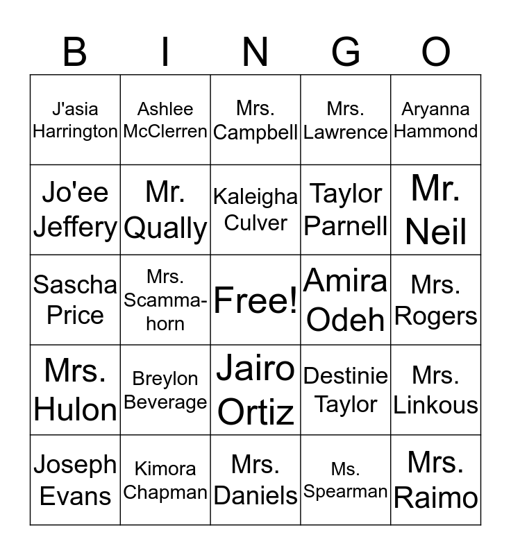 This bingo card has a free space and 24 words: Breylon Beverage, Kimora Chapman, Kaleigha Culver, Joseph Evans, Aryanna Hammond, J'asia Harrington, Jo'ee Jeffery, Ashlee McClerren, Amira Odeh, Jairo Ortiz, Taylor Parnell, Sascha Price, Destinie Taylor, Mrs. Linkous, Mr. Qually, Ms. Spearman, Mrs. Rogers, Mrs. Campbell, Mr. Neil, Mrs. Scamma-horn, Mrs. Raimo, Mrs. Hulon, Mrs. Lawrence and Mrs. Daniels.