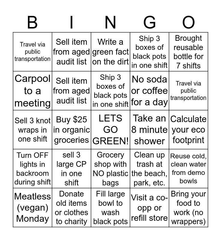 This bingo card has a free space and 24 words: sell 3 large CP in one shift, Donate old items or clothes to charity, Ship 3 boxes of black pots in one shift, Meatless (vegan) Monday, Brought reusable bottle for 7 shifts, Travel via public transportation, Carpool to a meeting, Sell item from aged audit list, Take an 8 minute shower, Grocery shop with NO plastic bags, No soda or coffee for a day, Sell 3 knot wraps in one shift, Clean up trash at the beach, park, etc., Reuse cold, clean water from demo bowls, Sell item from aged audit list, Visit a co-opp or refill store, Calculate your eco footprint, Write a green fact on the dirt, Travel via public transportation, Buy $25 in organic groceries, Bring your food to work (no wrappers), Turn OFF lights in backroom during shift, Ship 3 boxes of black pots in one shift and Fill large bowl to wash black pots.