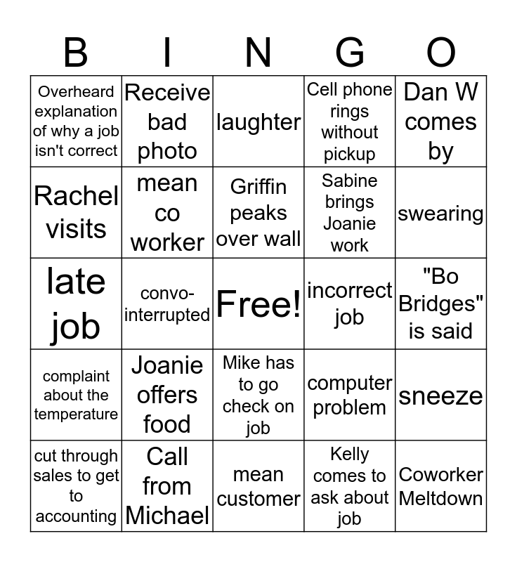 This bingo card has a free space and 24 words: cut through sales to get to accounting, Joanie offers food, Griffin peaks over wall, Kelly comes to ask about job, Dan W comes by, Overheard explanation of why a job isn't correct, Receive bad photo, laughter, incorrect job, "Bo Bridges" is said, late job, mean co worker, computer problem, sneeze, Rachel visits, Call from Michael, mean customer, Cell phone rings without pickup, swearing, complaint about the temperature, convo-interrupted, Mike has to go check on job, Sabine brings Joanie work and Coworker Meltdown.