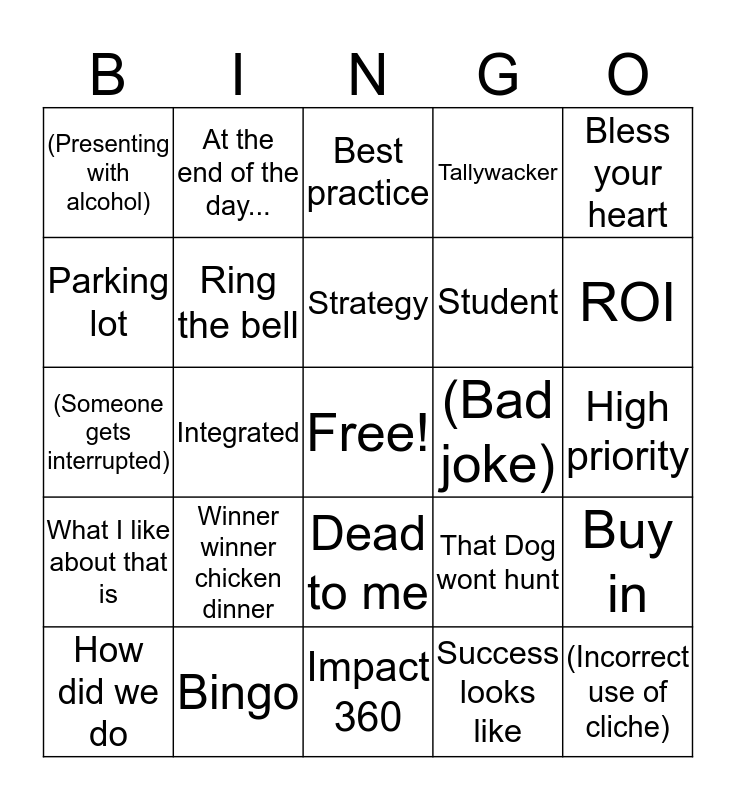 This bingo card has a free space and 59 words: Awesome, Bingo, What I wish is, What I like about that is, Success looks like, Goal, Ring the bell, It is my hope, Student, Learning, Tallywacker, Initiative, Parking lot, Solution, (Crickets when asked for thoughts or feedback), (Presenting with alcohol), (Incorrect use of cliche), Bless your heart, Impact, Strategy, (Bad joke), Best practice, How did we do, Buy in, (Typo in a PPT), Proposal, SalesForce, Soulman, ROI, (No filter), Circle back, Glory hole, (Bad travel story), Fix your face, At the end of the day..., Silo, Comprehensive, Integrated, Jet stream, (Someone gets interrupted), Low-hanging fruit, Winner winner chicken dinner, High priority, Imma poke him/her, Sweet spot, Intentional, Office Nonsense, Power Couple, Dead to me, Impact 360, O dark thiry, Red Marks, Workiversary, Drone Footage, Hardhat, That Dog wont hunt, Lets call a space a shovel, Bobblehead and Masterplan.