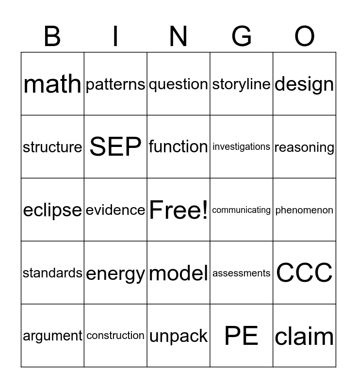 This bingo card has a free space and 24 words: energy, construction, function, argument, design, math, structure, patterns, communicating, model, investigations, eclipse, assessments, CCC, SEP, PE, phenomenon, question, reasoning, evidence, claim, standards, storyline and unpack.