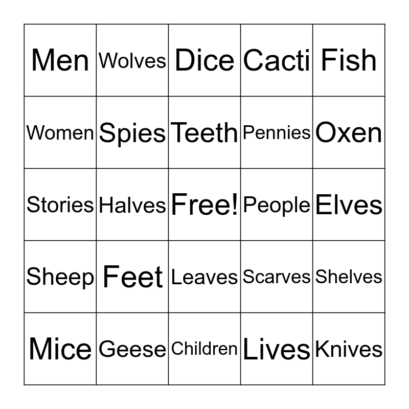This bingo card has a free space and 25 words: Feet, Children, Teeth, Mice, Fish, Men, Women, Wolves, People, Leaves, Pennies, Stories, Scarves, Shelves, Spies, Loaves, Elves, Dice, Oxen, Halves, Knives, Geese, Sheep, Cacti and Lives.
