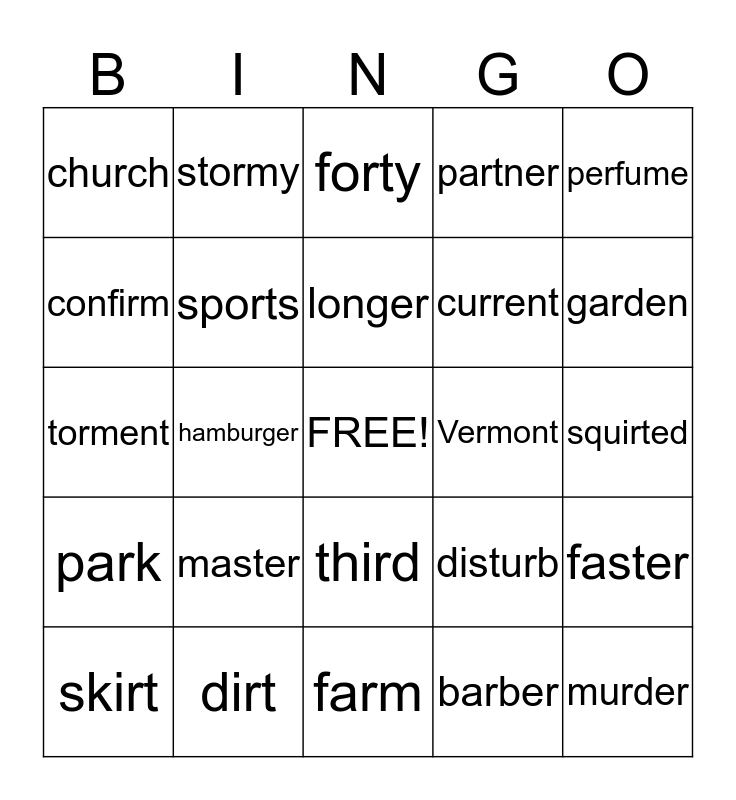 This bingo card has a free space and 51 words: manners, master, butler, barber, garden, afford, stormy, correct, current, murder, torment, sports, disturb, squirted, thirsty, acorn, forty, Vermont, interrupt, confirm, hamburger, farther, partner, perfume, butter, bigger, longer, slower, faster, church, hurdle, curl, nurse, purse, turkey, turtle, sunburn, curve, squirt, first, dirt, third, bird, smirk, skirt, shirt, farm, car, chart, park and jar.