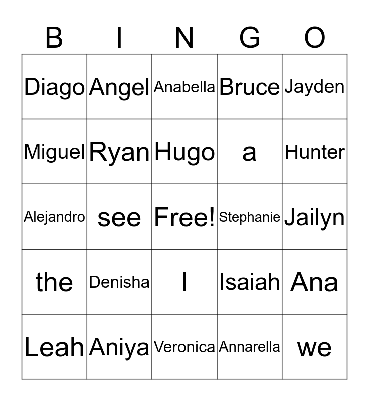 This bingo card has a free space and 24 words: Leah, Denisha, Hugo, Annarella, Jayden, Diago, Angel, Anabella, Stephanie, Jailyn, Alejandro, Ryan, Isaiah, Ana, Miguel, Aniya, Veronica, Bruce, Hunter, the, see, I, a and we.