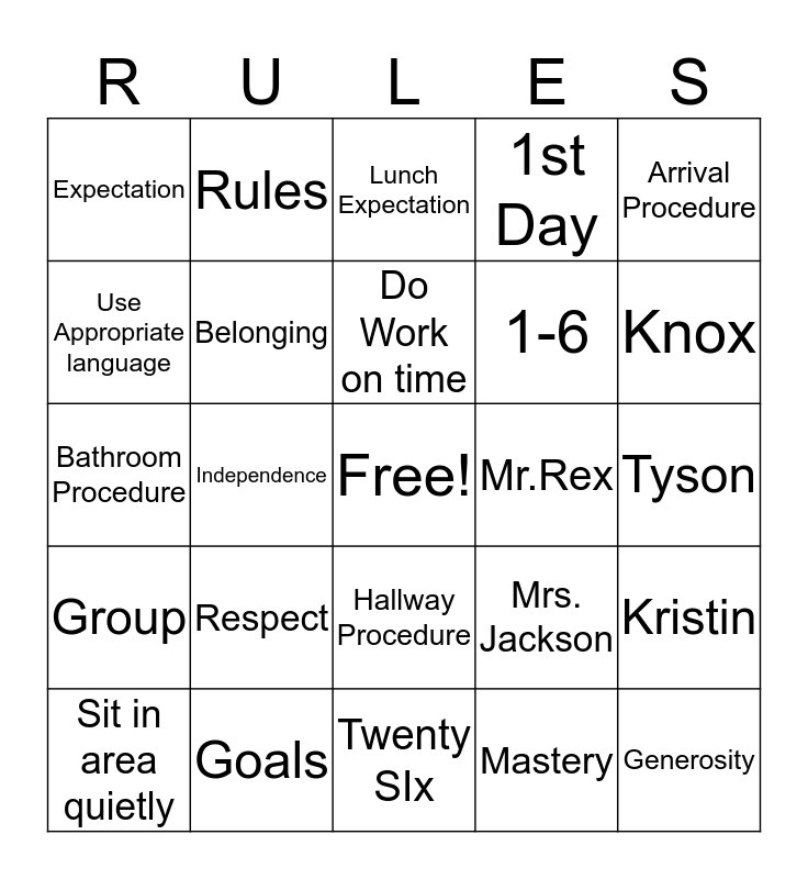 This bingo card has a free space and 24 words: Respect, Goals, Do Work on time, Sit in area quietly, Arrival Procedure, Expectation, Use Appropriate language, Rules, Mr.Rex, Hallway Procedure, 1-6, Bathroom Procedure, Mrs. Jackson, Kristin, Belonging, Mastery, Tyson, Lunch Expectation, Knox, Independence, Generosity, Group, 1st Day and Twenty SIx.