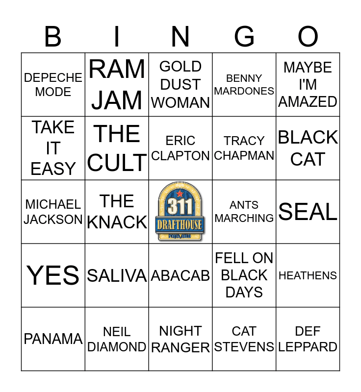 This bingo card has a free space and 24 words: SALIVA, NEIL DIAMOND, ERIC CLAPTON, PANAMA, MAYBE I'M AMAZED, DEPECHE MODE, TAKE IT EASY, RAM JAM, ANTS MARCHING, ABACAB, TRACY CHAPMAN, MICHAEL JACKSON, FELL ON BLACK DAYS, HEATHENS, THE CULT, CAT STEVENS, SEAL, GOLD DUST WOMAN, BLACK CAT, THE KNACK, DEF LEPPARD, YES, BENNY MARDONES and NIGHT RANGER.