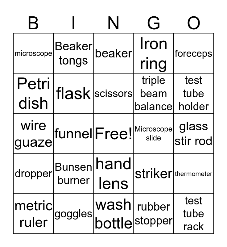 This bingo card has a free space and 24 words: Bunsen burner, goggles, scissors, metric ruler, foreceps, microscope, Petri dish, Beaker tongs, Microscope slide, hand lens, triple beam balance, wire guaze, striker, thermometer, flask, rubber stopper, glass stir rod, beaker, test tube holder, funnel, test tube rack, dropper, Iron ring and wash bottle.