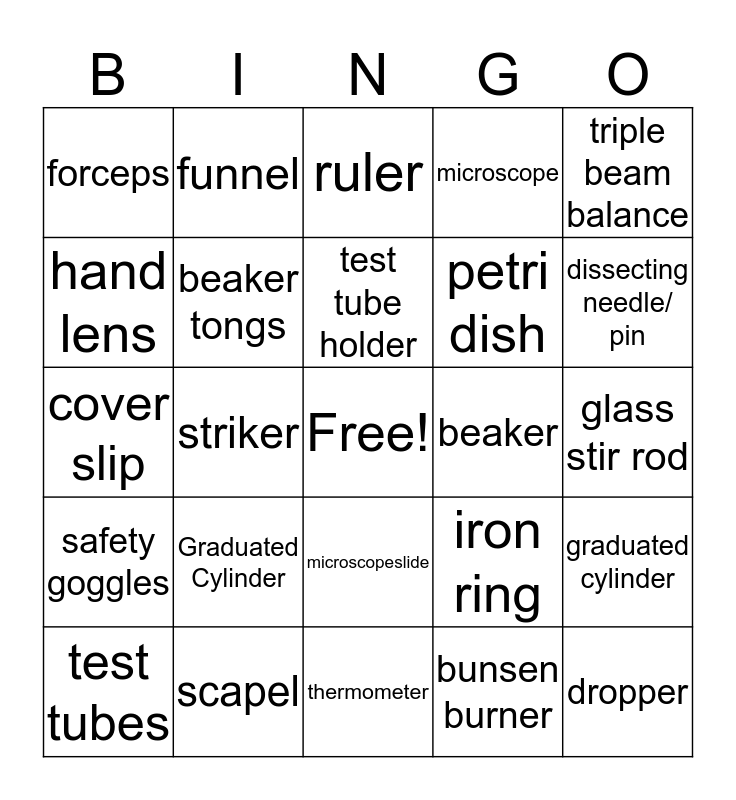 This bingo card has a free space and 24 words: Graduated Cylinder, scapel, test tube holder, test tubes, triple beam balance, forceps, hand lens, funnel, beaker, microscopeslide, petri dish, cover slip, iron ring, graduated cylinder, beaker tongs, bunsen burner, glass stir rod, ruler, dissecting needle/ pin, striker, dropper, safety goggles, microscope and thermometer.