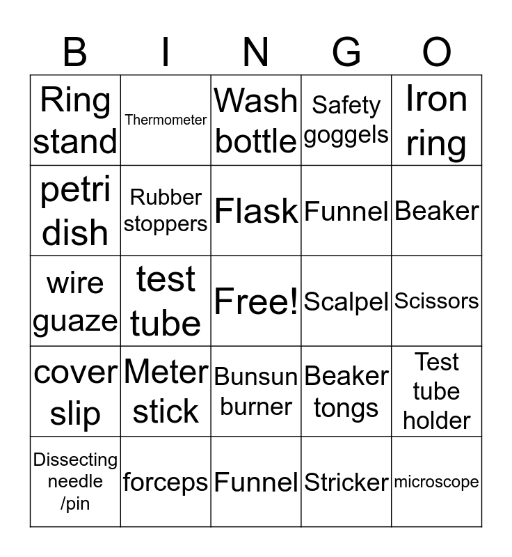 This bingo card has a free space and 24 words: Meter stick, forceps, Flask, Dissecting needle /pin, Iron ring, Ring stand, petri dish, Thermometer, Scalpel, Bunsun burner, Funnel, wire guaze, Beaker tongs, Test tube holder, Rubber stoppers, Stricker, Scissors, Wash bottle, Beaker, test tube, microscope, cover slip, Safety goggels and Funnel.