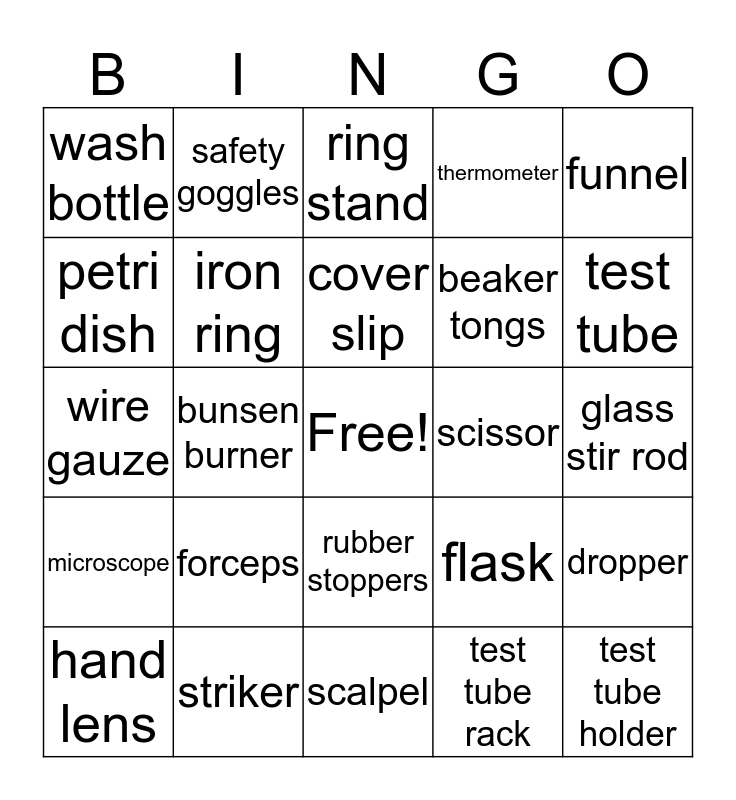 This bingo card has a free space and 24 words: forceps, striker, cover slip, hand lens, funnel, wash bottle, petri dish, safety goggles, scissor, rubber stoppers, beaker tongs, wire gauze, flask, dropper, iron ring, test tube rack, glass stir rod, ring stand, test tube, bunsen burner, test tube holder, microscope, thermometer and scalpel.