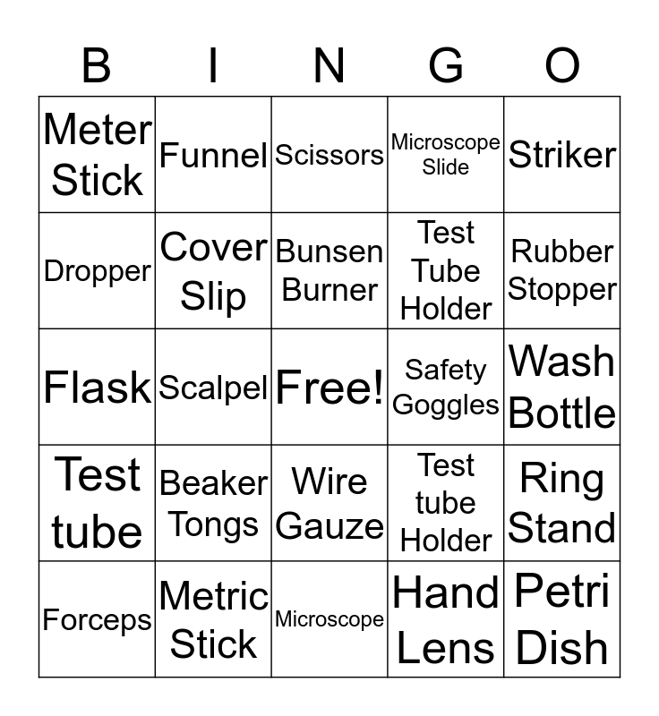 This bingo card has a free space and 24 words: Beaker Tongs, Metric Stick, Bunsen Burner, Forceps, Striker, Meter Stick, Dropper, Funnel, Safety Goggles, Wire Gauze, Test Tube Holder, Flask, Test tube Holder, Ring Stand, Cover Slip, Hand Lens, Wash Bottle, Scissors, Rubber Stopper, Scalpel, Petri Dish, Test tube, Microscope Slide and Microscope.