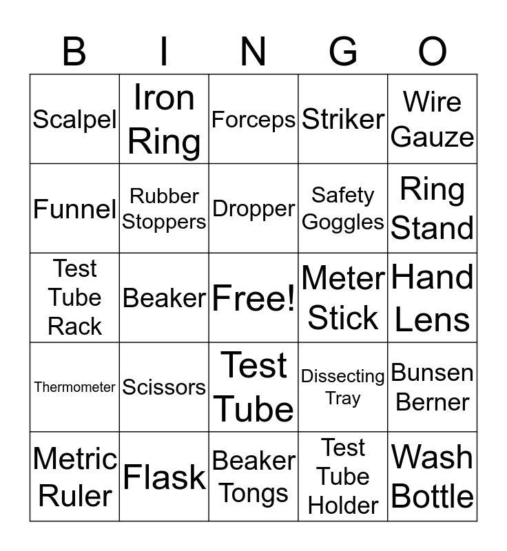This bingo card has a free space and 24 words: Scissors, Flask, Dropper, Metric Ruler, Wire Gauze, Scalpel, Funnel, Iron Ring, Meter Stick, Test Tube, Safety Goggles, Test Tube Rack, Dissecting Tray, Bunsen Berner, Rubber Stoppers, Test Tube Holder, Hand Lens, Forceps, Ring Stand, Beaker, Wash Bottle, Thermometer, Striker and Beaker Tongs.