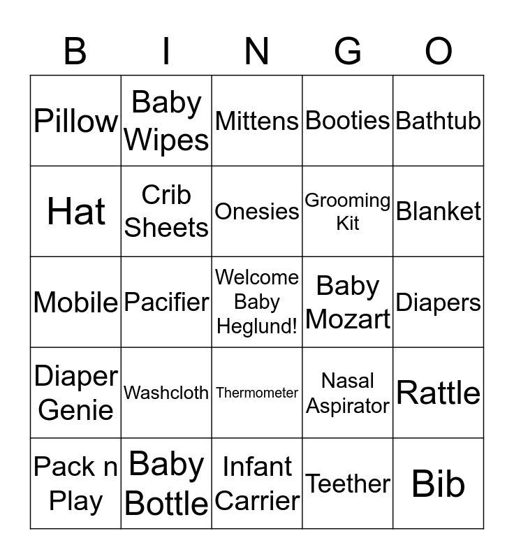 This bingo card has a free space and 24 words: Washcloth, Baby Bottle, Onesies, Pack n Play, Bathtub, Pillow, Hat, Baby Wipes, Baby Mozart, Thermometer, Grooming Kit, Mobile, Nasal Aspirator, Rattle, Crib Sheets, Teether, Diapers, Mittens, Blanket, Pacifier, Bib, Diaper Genie, Booties and Infant Carrier.