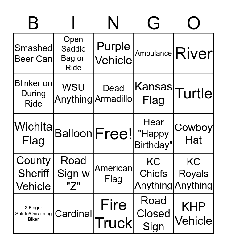 This bingo card has a free space and 24 words: Road Sign w "Z", Cardinal, Dead Armadillo, 2 Finger Salute/Oncoming Biker, River, Smashed Beer Can, Blinker on During Ride, Open Saddle Bag on Ride, Hear "Happy Birthday", American Flag, Kansas Flag, Wichita Flag, KC Chiefs Anything, KC Royals Anything, WSU Anything, Road Closed Sign, Cowboy Hat, Purple Vehicle, Turtle, Balloon, KHP Vehicle, County Sheriff Vehicle, Ambulance and Fire Truck.