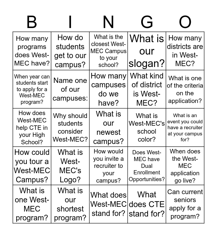 This bingo card has 25 words: What is West-MEC's Logo?, What does West-MEC stand for?, How many campuses do we have?, What is one West-MEC program?, How many districts are in West-MEC?, How many programs does West-MEC have?, When year can students start to apply for a West-MEC program?, How do students get to our campus?, What is West-MEC's school color?, How would you invite a recruiter to your campus?, What kind of district is West-MEC?, How does West-MEC help CTE in your High School?, Does West-MEC have Dual Enrollment Opportunities?, When does the West-MEC application go live?, Name one of our campuses:, Can current seniors apply for a program?, What is an event you could have a recruiter at your campus for?, What is the closest West-MEC Campus to your school?, What is one of the criteria on the application?, Why should students consider West-MEC?, What is our newest campus?, What is our shortest program?, How could you tour a West-MEC Campus?, What is our slogan? and What does CTE stand for?.