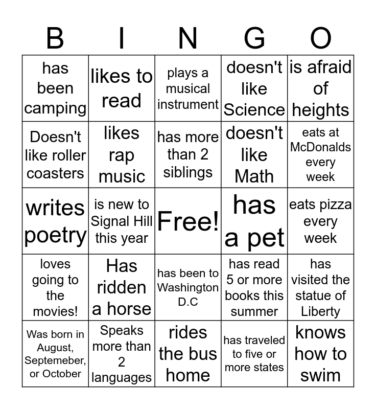 This bingo card has a free space and 24 words: Has ridden a horse, Speaks more than 2 languages, has more than 2 siblings, Was born in August, Septemeber, or October, is afraid of heights, has been camping, Doesn't like roller coasters, likes to read, has a pet, has been to Washington D.C, doesn't like Math, writes poetry, has read 5 or more books this summer, has visited the statue of Liberty, likes rap music, has traveled to five or more states, eats pizza every week, plays a musical instrument, eats at McDonalds every week, is new to Signal Hill this year, knows how to swim, loves going to the movies!, doesn't like Science and rides the bus home.