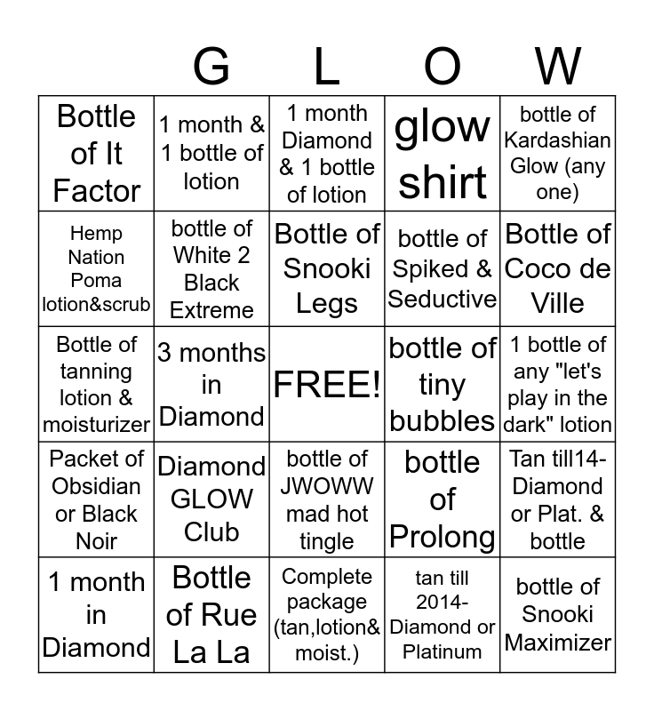 This bingo card has a free space and 24 words: Diamond GLOW Club, Bottle of Rue La La, Bottle of Snooki Legs, 1 month in Diamond, bottle of Kardashian Glow (any one), Bottle of It Factor, Hemp Nation Poma lotion&scrub, 1 month & 1 bottle of lotion, bottle of tiny bubbles, bottle of JWOWW mad hot tingle, bottle of Spiked & Seductive, Bottle of tanning lotion & moisturizer, bottle of Prolong, Tan till14-Diamond or Plat. & bottle, bottle of White 2 Black Extreme, tan till 2014-Diamond or Platinum, 1 bottle of any "let's play in the dark" lotion, 1 month Diamond & 1 bottle of lotion, Bottle of Coco de Ville, 3 months in Diamond, bottle of Snooki Maximizer, Packet of Obsidian or Black Noir, glow shirt and Complete package (tan,lotion& moist.).