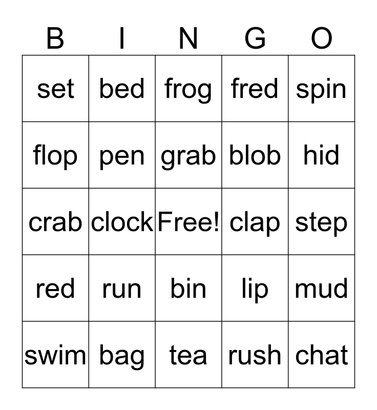 This bingo card has a free space and 24 words: run, bag, grab, swim, spin, set, flop, bed, clap, bin, blob, crab, lip, mud, pen, rush, step, frog, hid, clock, chat, red, fred and tea.